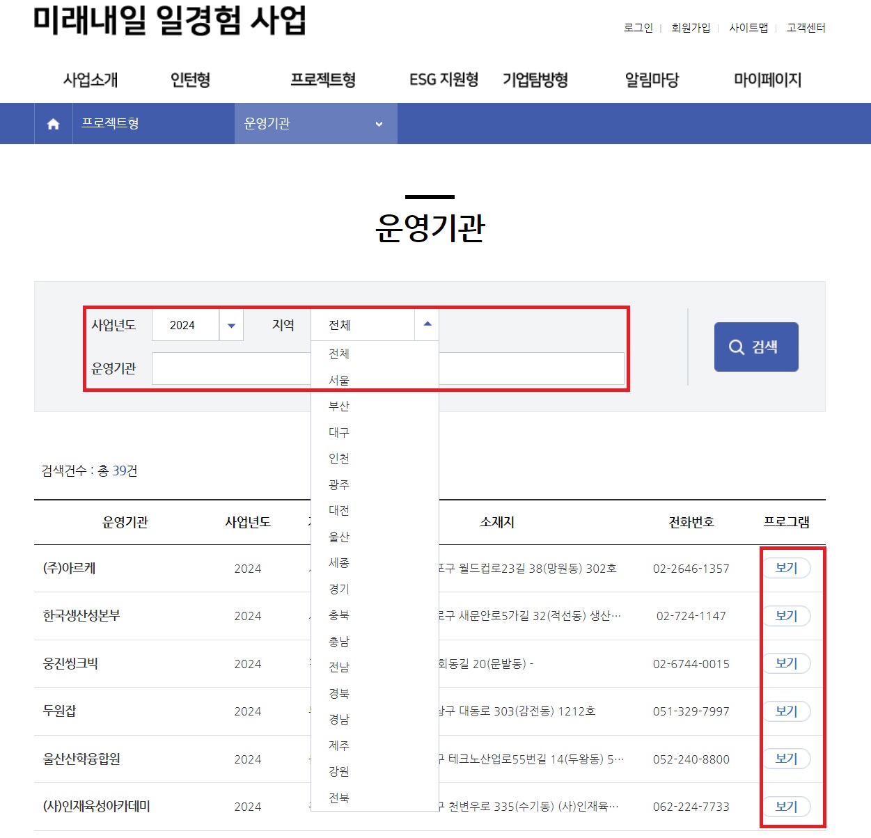 내가 원하는 사업의 항목을 선핵하고 들어가면 각 프로그램의 명과 지역, 경영, 사무, 회계, 영업 등의 각 직무별로 검색이 가능하고 신청 가능한 업체를 찾을 수도 있고 현재 모집중인 프로그램들의 리스트를 확인 할 수도 있습니다.