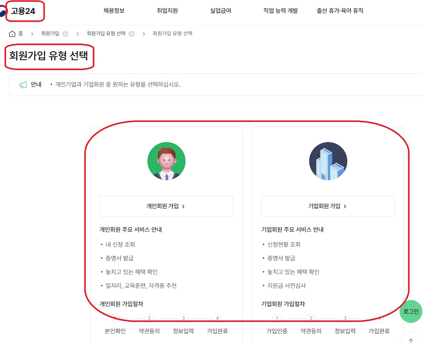 회원가입은 고용 24 홈페이지로 연결되며 개인회원으로 가입하면 됩니다. (가입 상담센터 1811-8447)
